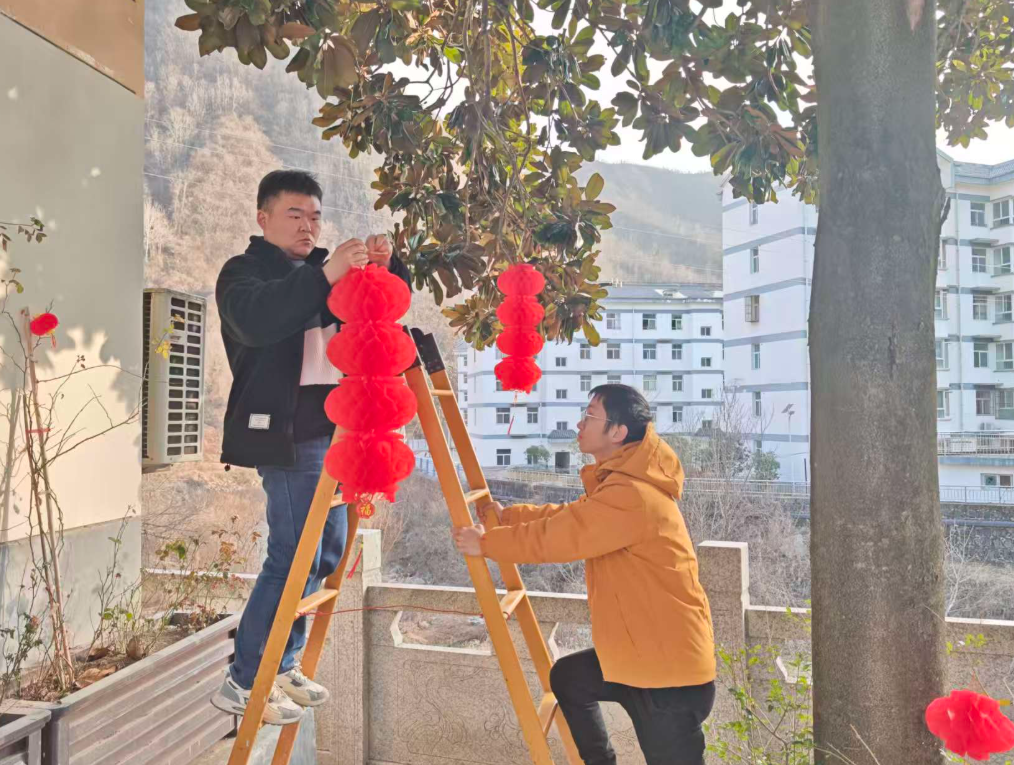 燈籠高掛,點亮傳統(tǒng)年味。在街頭巷尾、居民安置點、橋梁等公共區(qū)域,志愿者們手提小燈籠,搭建樓梯,將一盞盞紅彤彤的小燈籠穩(wěn)穩(wěn)掛于樹梢、綠植等,為節(jié)日增添喜慶亮色。街道兩旁張燈結(jié)彩,火紅的大燈籠與福字隨風輕擺,點亮了歸鄉(xiāng)游子的心燈,也映照出新時代鄉(xiāng)村的蓬勃生機與文明氣象。